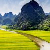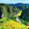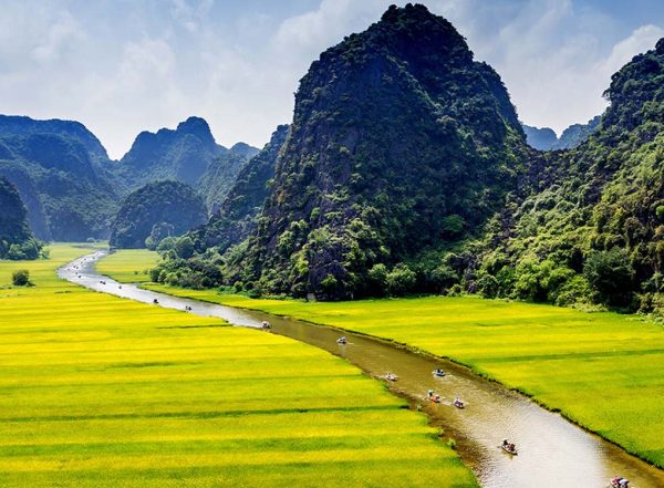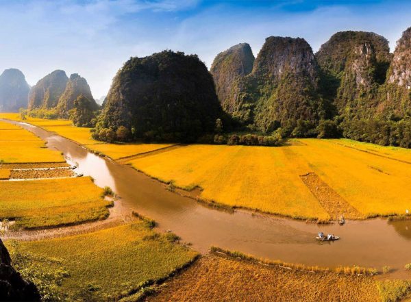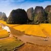 ✅ Ngồi thuyền Tam Cốc – du ngoạn giữa non nước hữu tình, lúa vàng hai bên sông Ngô Đồng uốn lượn quanh núi đá vôi.