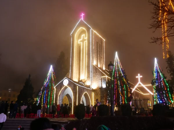18h00: Quý khách ăn tối sau đó tự do vui chơi: Chụp hình với Nhà thờ Đá Sapa, tìm hiểu đêm chợ tình Sapa vào các tối thứ 7 hàng tuần hay đơn giản là thưởng thức những món ăn đặc sản nướng uống cùng rượu San Lùng nổi tiếng để sưởi ấm cái lạnh của Sapa.